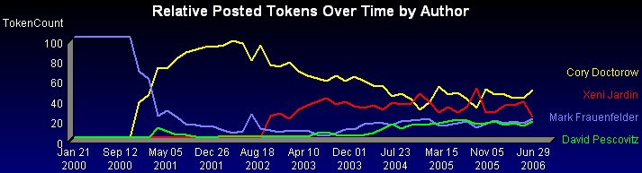 Plotting the relative fraction for each author over time highlights the fact that Mark was the only contributor initially, Cory was the dominant contributor by far in 2001-2002, and that the four author's relative contributions have remained roughly stable over 2005 and the first half of 2006.