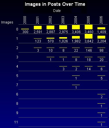 This graph show a number of interesting things. First of all, there were virtually no images in posts prior to about 4Q 2001. Looking at the data with a finer grained time scale (which isn't shown here) confirms that the first images occurred in October 2001.