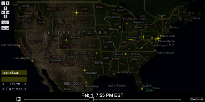 I've gathered some tweets sent during the time of the superbowl last night and created another map-based tool to visualize them. I took every 10th tweet from 6:00 pm to 10:30 pm EST that contained 'superbowl' or 'super bowl' and plotted all those for which I could find the longitude and latitude coordinates of the author. This process yielded 5711 tweets to explore. The interactive tool can be found here - Superbowl Twitter Visualization.