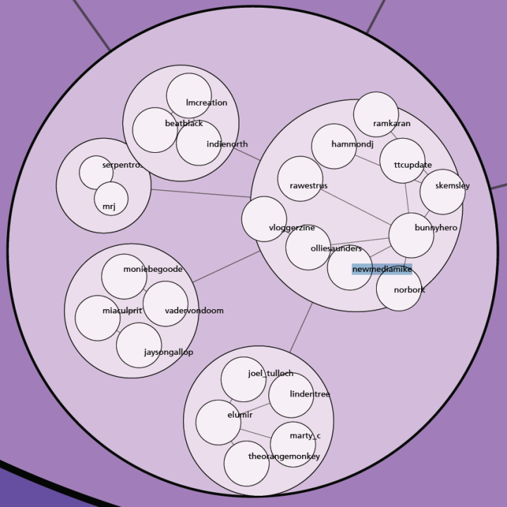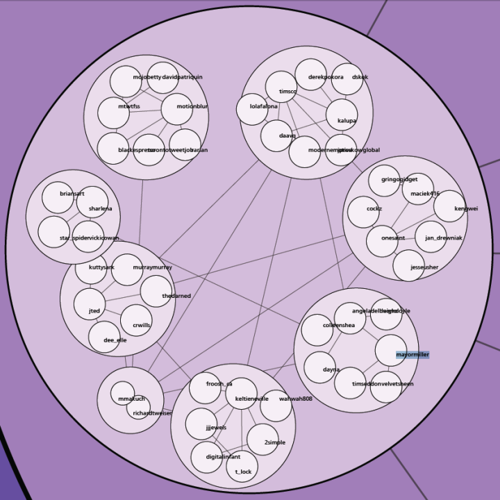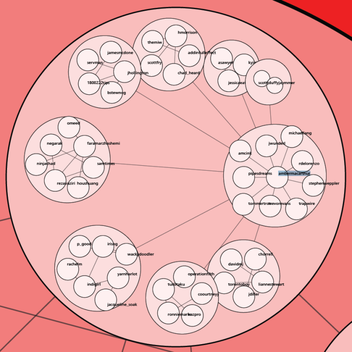 Such a large set of nodes and edges is difficult to represent visually in a pleasing manner. With this many connections a standard node and edge diagram is usually a tangled mess. I tried to overcome this by clustering nodes together in a hierarchical fashion based on the connections between them. Connections between individual twitter IDs are only drawn if they are within the same group. Edges are drawn at the group level to show relationships between groups.