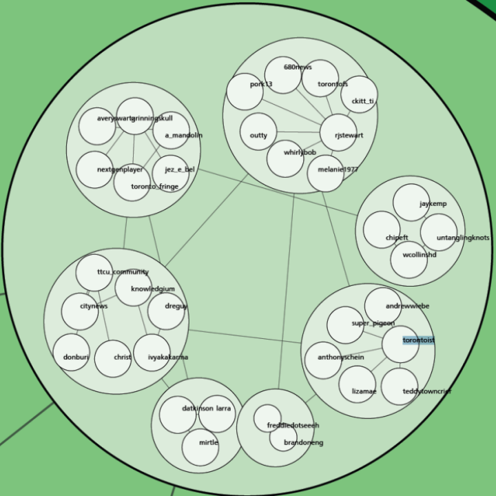 If you want to examine the structural map more closely then look at the PDF version of the Toronto Twitter Community Structure. You can do a text search on a name within a PDF viewer to see where you are and who you've been grouped with. Note that a bug in my tools prevented me from placing the text labels precisely where I wanted and when they overlap with another label the text search may fail.