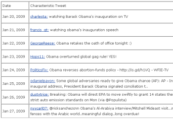 Characteristic Tweets are statistically selected to be representative of a set of tweets by use of words that are relatively prominent in that set compared to other sets. If a large collection of related tweets are broken into sets based on the time they were sent then this technique can build a 'tweet narrative' by choosing the most representative tweet from each time period. |