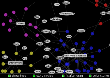 Digg Story Graph is an interactive visualization that shows the relationships between recent popular stories on Digg through the use of node and link diagrams. Stories can be visually connected through shared vocabulary, common topics, domain, submitter, or date submitted. |