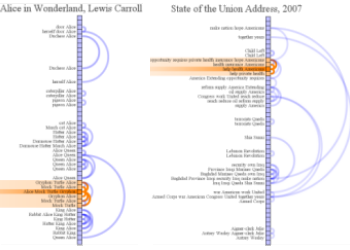 Document Arc Diagrams illustrate the similarity structure within a text document by drawing arcs connecting segments of a document that share similar vocabulary. |