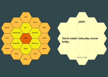 The Honeycomb Navigator is the result of a small freelance project I completed for the site ButterBeeHappy.com . Basically, the site lets you easily keep a journal of those things that make you happy or that you are grateful for. My Honeycomb Navigator lets you see the words used most often in your entries as well as which other words are associated with them. You can also explore the things that made you, or other people, happy by hovering over and clicking on particular cells. |