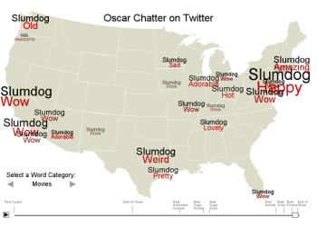 Oscar Twitter Map shows textual information extracted from tweets directly on a simple US map. The tool supports exploration over time and the text analysis shows things like which adjectives were most closely associated with particular actors at various times throughout the evening. |
