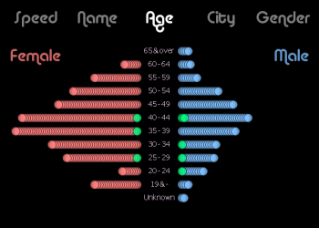 The Race Results Analyzer allows exploring results for a running race. The small circles represent athletes and they are smoothly transitioned between their positions within various graphical views. |