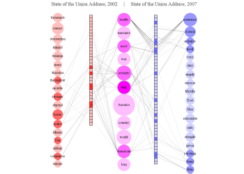 Shared Word Diagrams compare and contrast two documents by showing both the unique and shared vocabulary and its' distribution across the two documents of interest. |