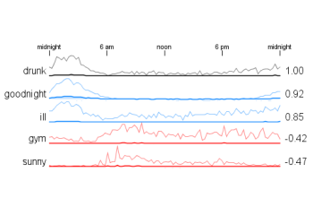 Time of Day Word Correlations show which words are used in tweets during the same times of day as well as the words that are negatively correlated over time. |