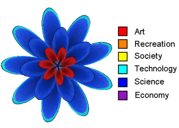 Topic Flowers are flowers generated based on properties derived from an input text. The words in the text are analyzed to determine the high-level topics that are discussed which are mapped to the colours used in the flower. Various other properties of the text drive things like number of petals, shape of petals, and the number of little hair-like fibers on the flower. |