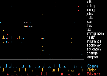 The Transcript Analyzer is a tool to visualize debate transcripts. The top section shows the distribution of some selected words within the text across a 'timeline' which goes from left to right. Right below the word distribution graphs is another set of bars showing a spectral decomposition of the text based on who spoke and how much was said. In this case the bar heights give the amount of text for each segment. |