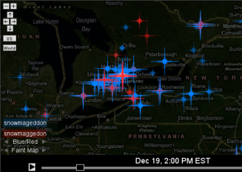 Zoomable Twitter Map supports exploring tweets along the dimensions of time, geography, and the actual message content. The timeline control can be played or manually scrolled, the map zoomed in and out, and filters can be defined that control which tweets to show. |